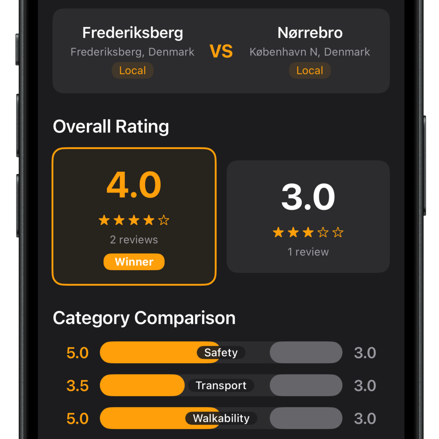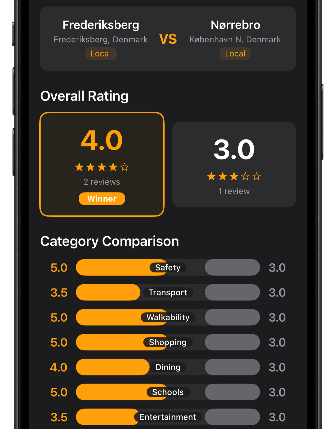 See detailed written reviews from former and current residents for each area, alongside the most important factors when moving to a new neighborhood (including Safety, Public Transportation, Grocery Shopping, Quietness, Schools and more), or simply see the overall rating.